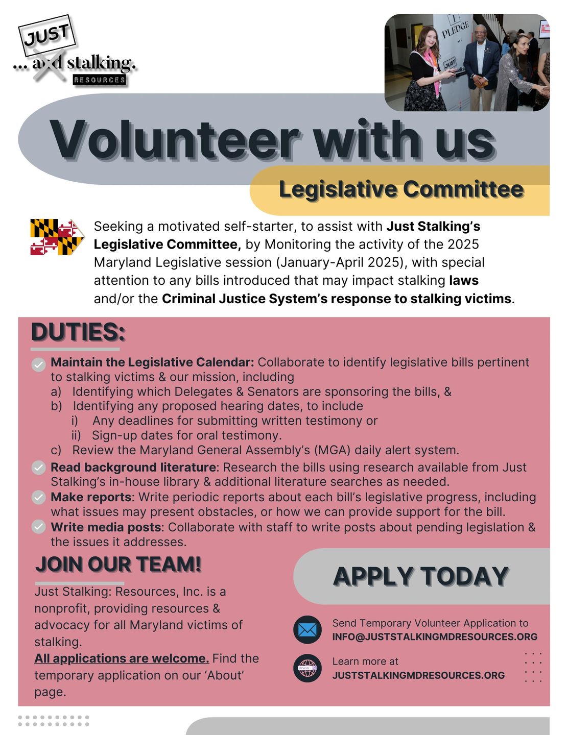 If you are interested, please fill out a temporary volunteer application & email it to admin@juststalkingmdresources.org. Email us with any questions.